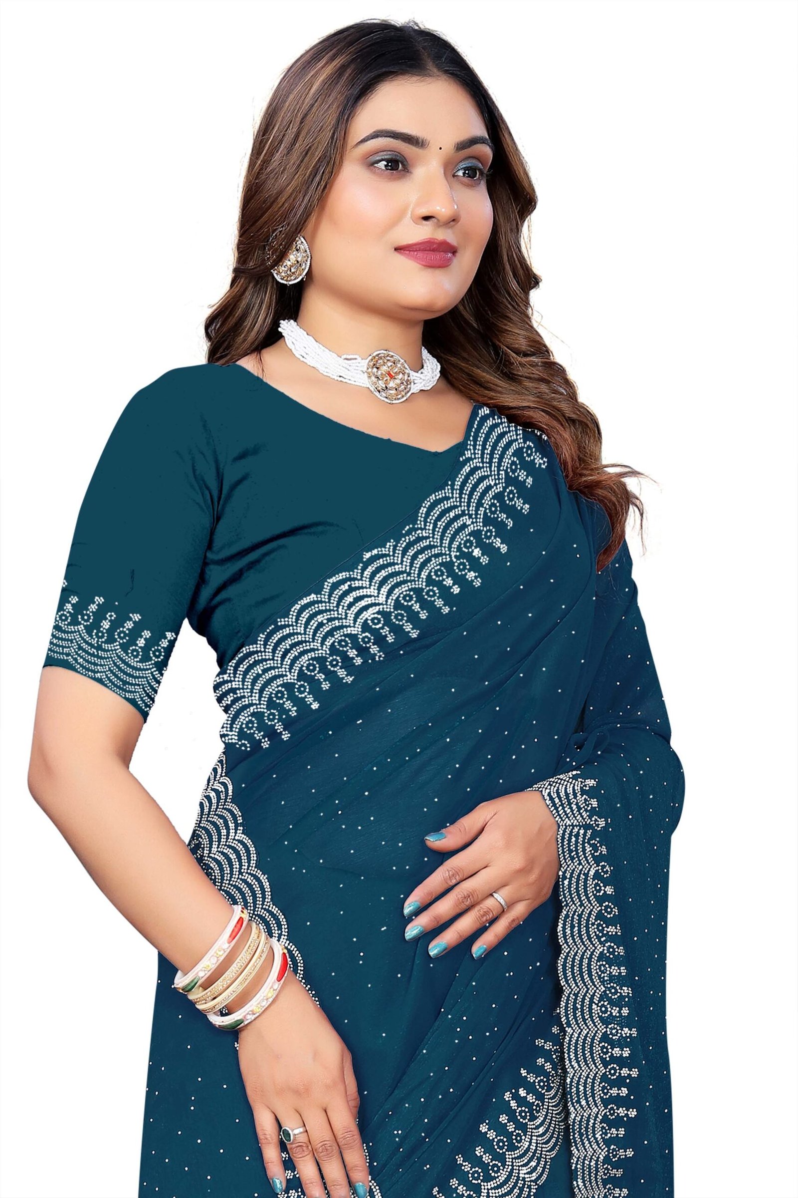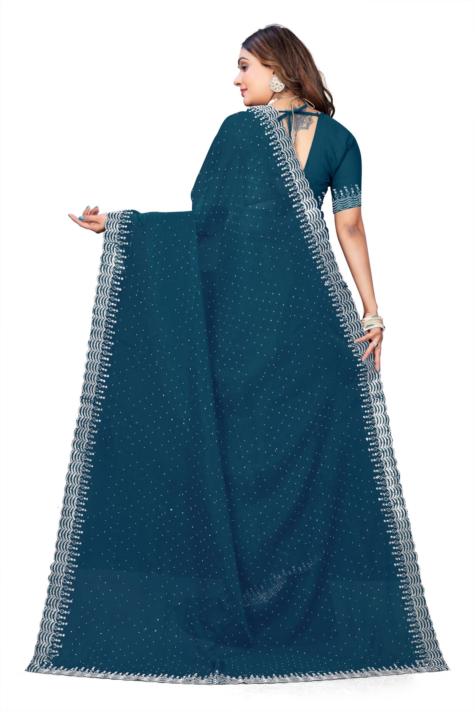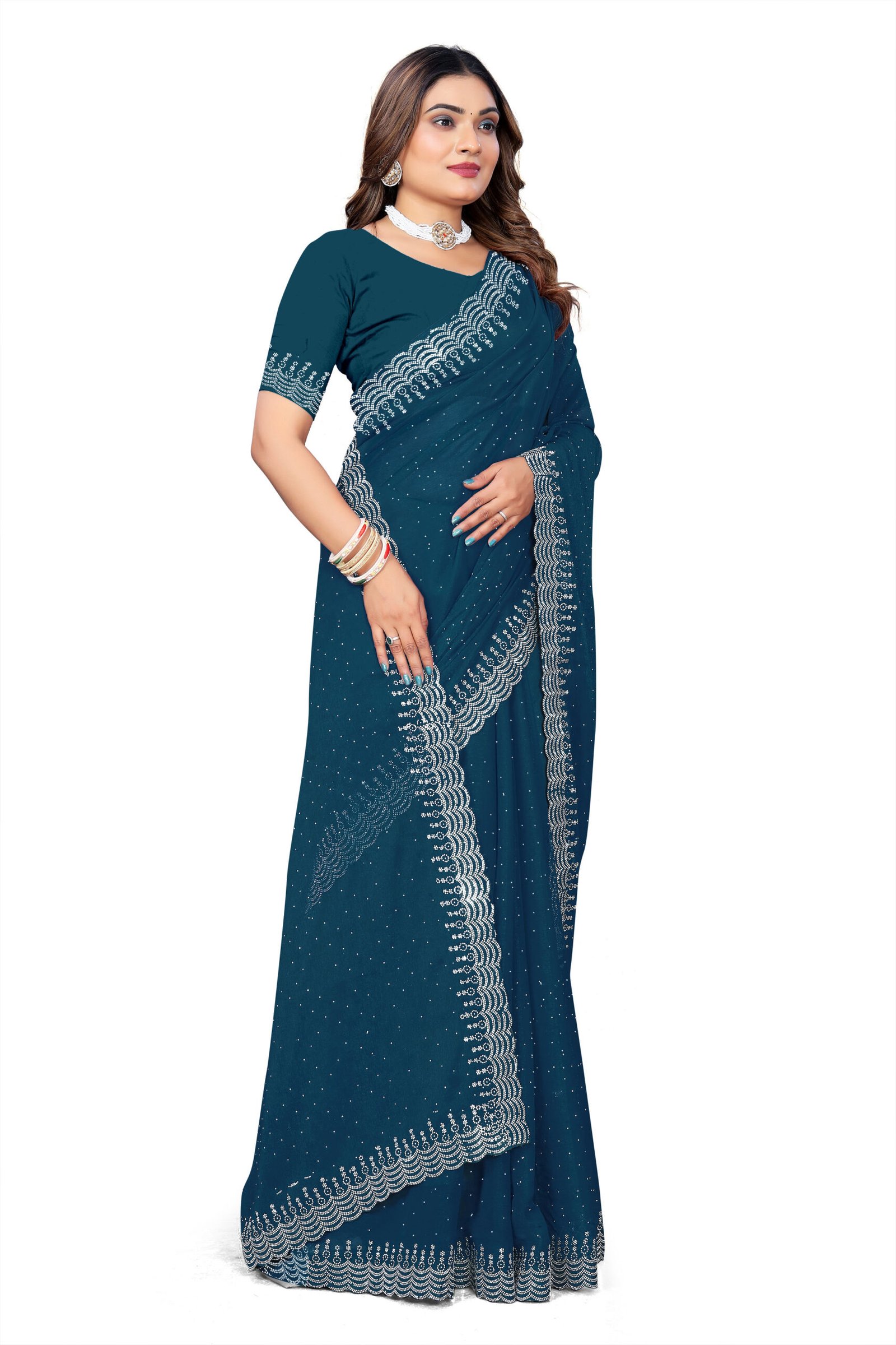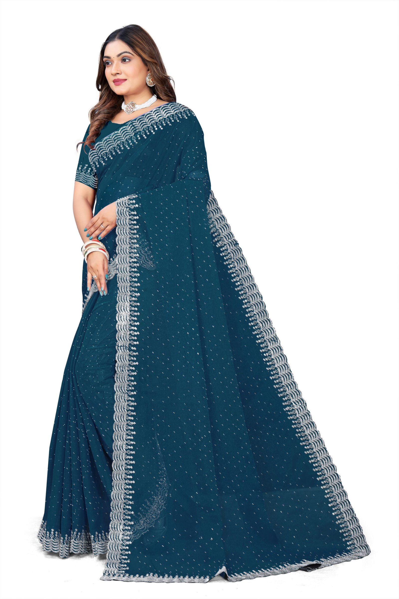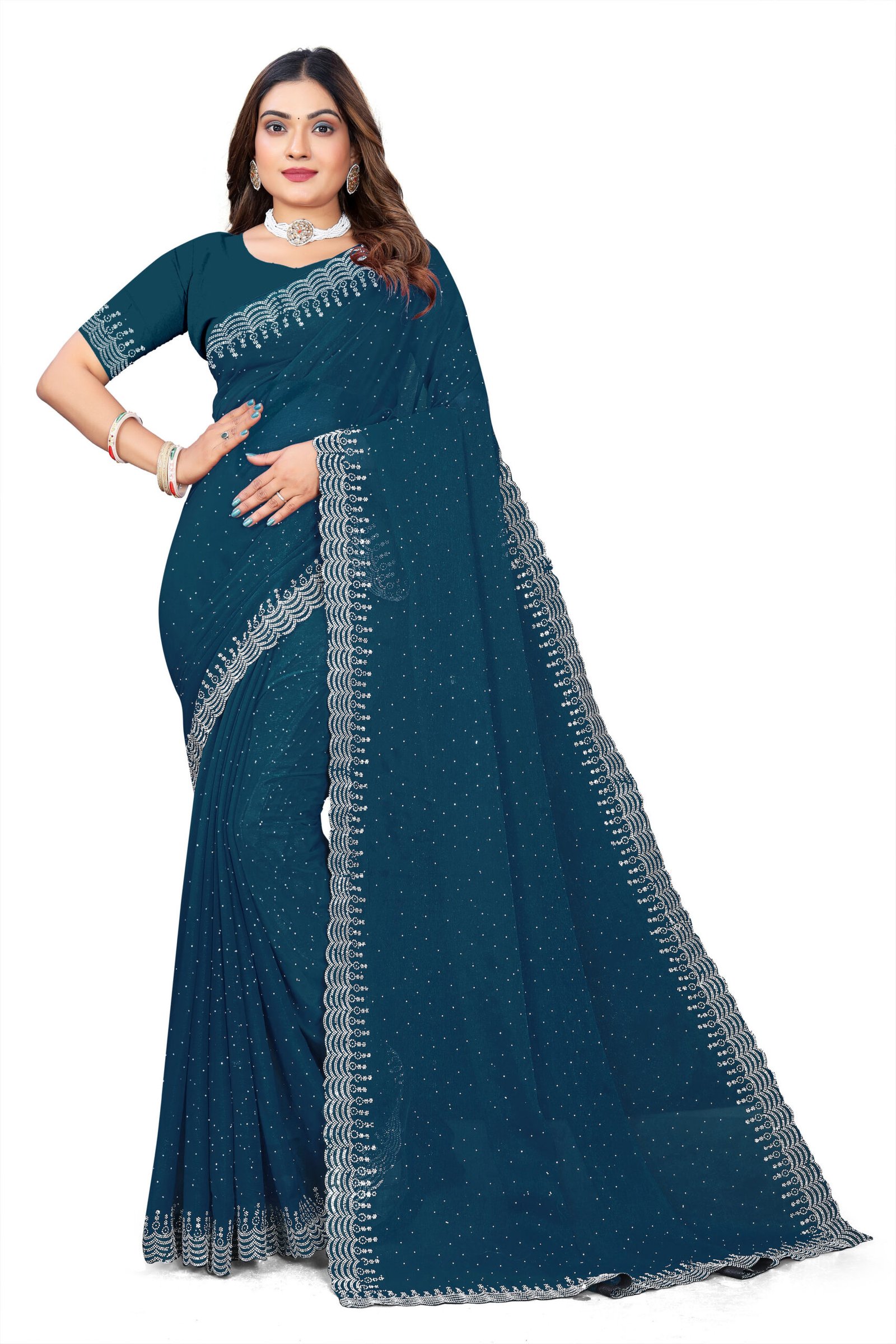 Experience ethereal elegance in our Chinnon Saree, crafted from soft, flowing chinnon fabric renowned for its subtle texture, breathability, and beautiful drape that flatters every curve. The rich hue is elevated by dazzling white sequin borders and pallu adorned with exquisite Siroski stone work, creating a mesmerizing sparkle ideal for special occasions. This complete set includes a running blouse piece with a generous 6-meter length, allowing for versatile styling and a custom fit. Perfect for bridesmaids, receptions, or cultural festivities, it blends traditional craftsmanship with modern glamour for a timeless, head-turning look.