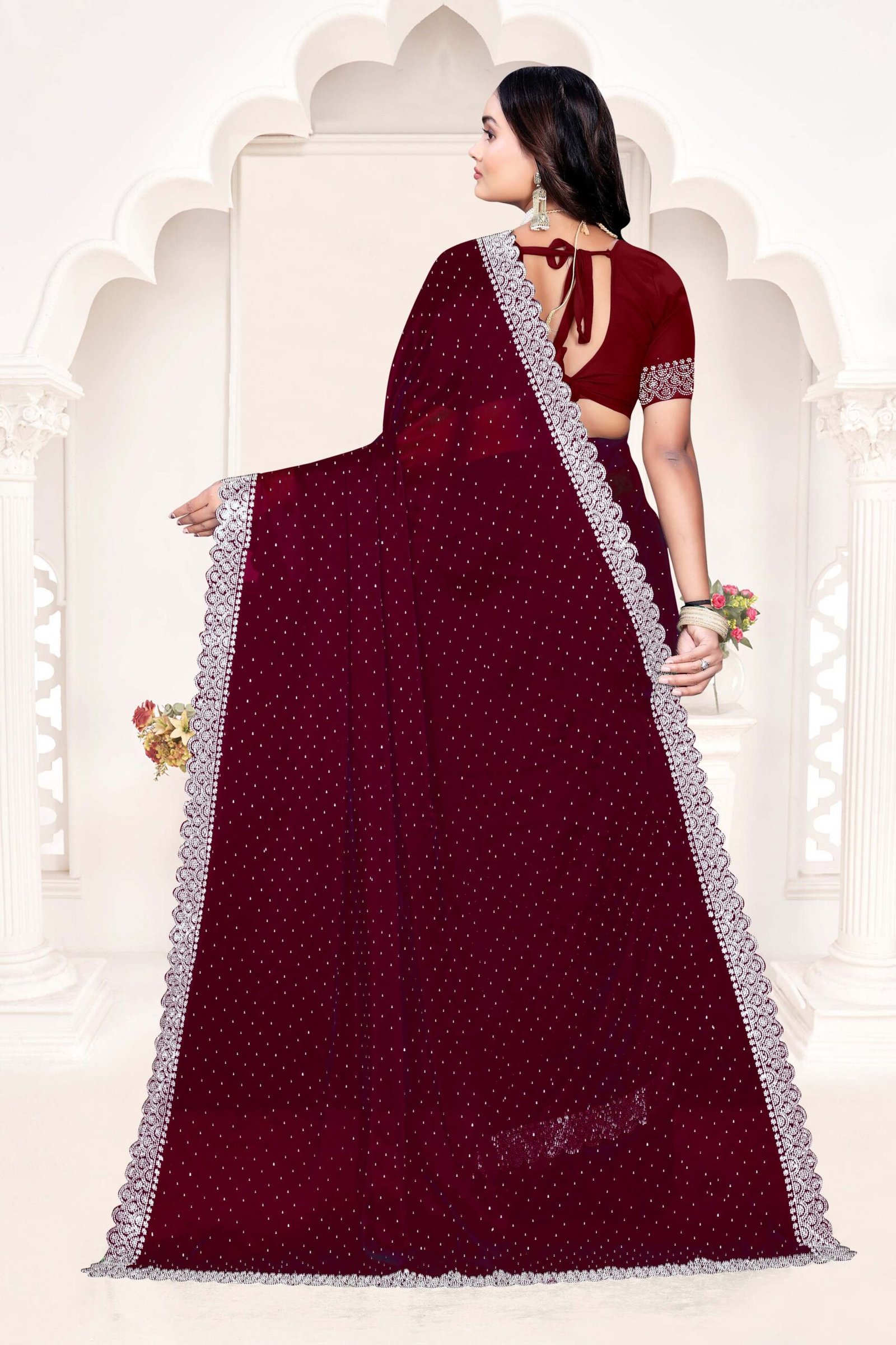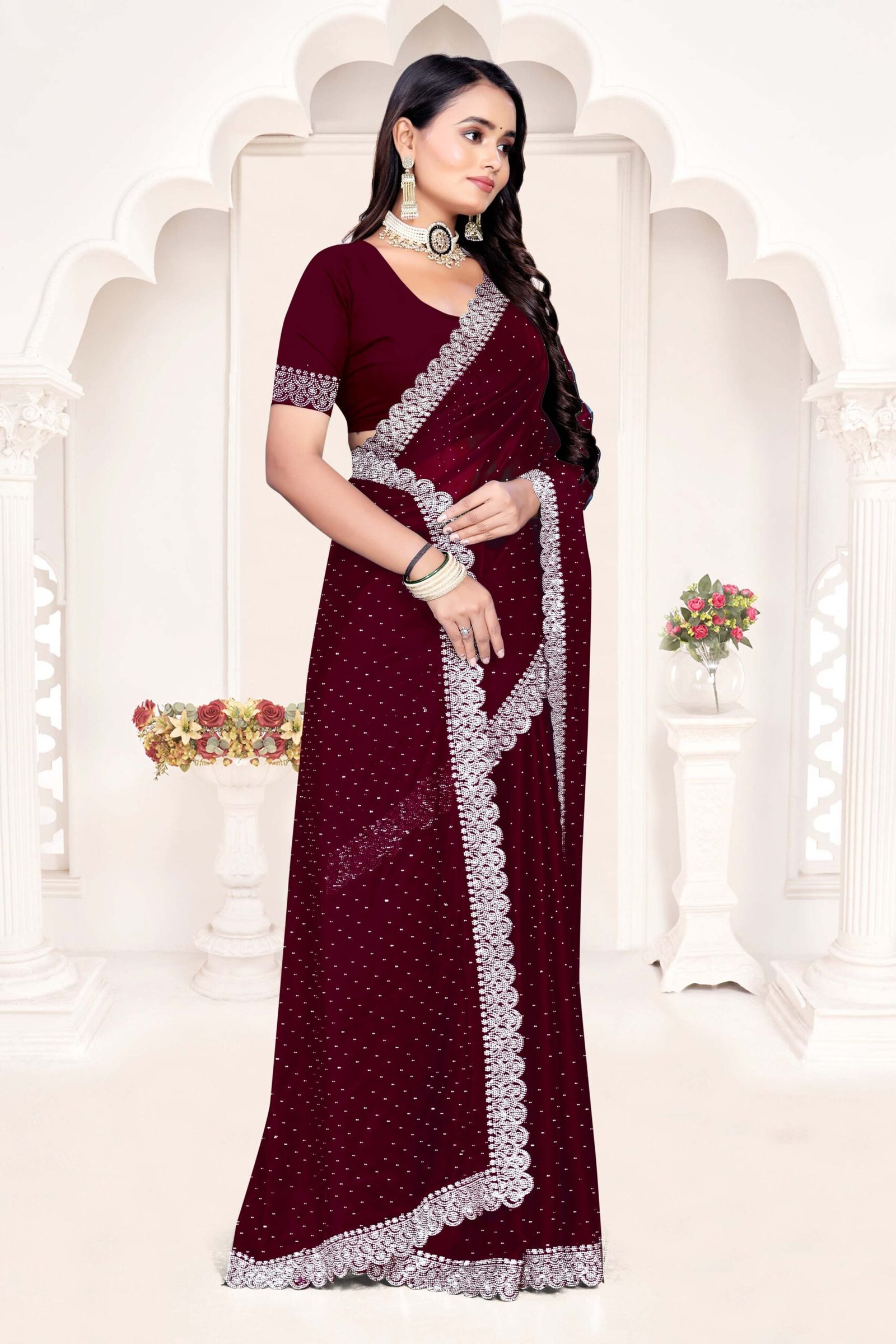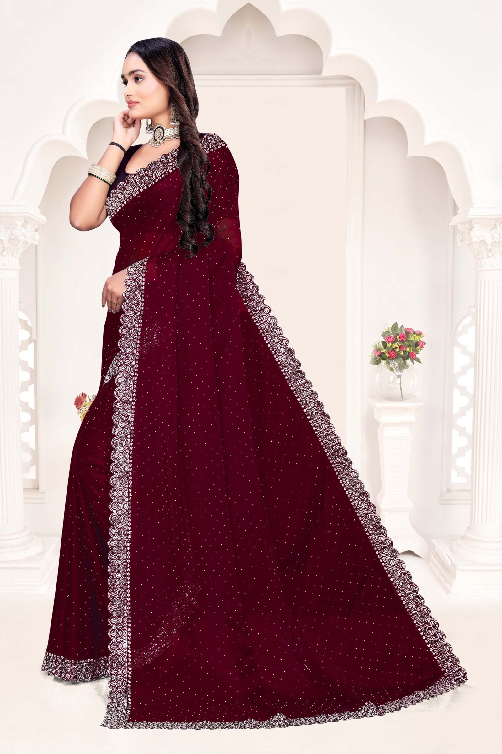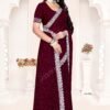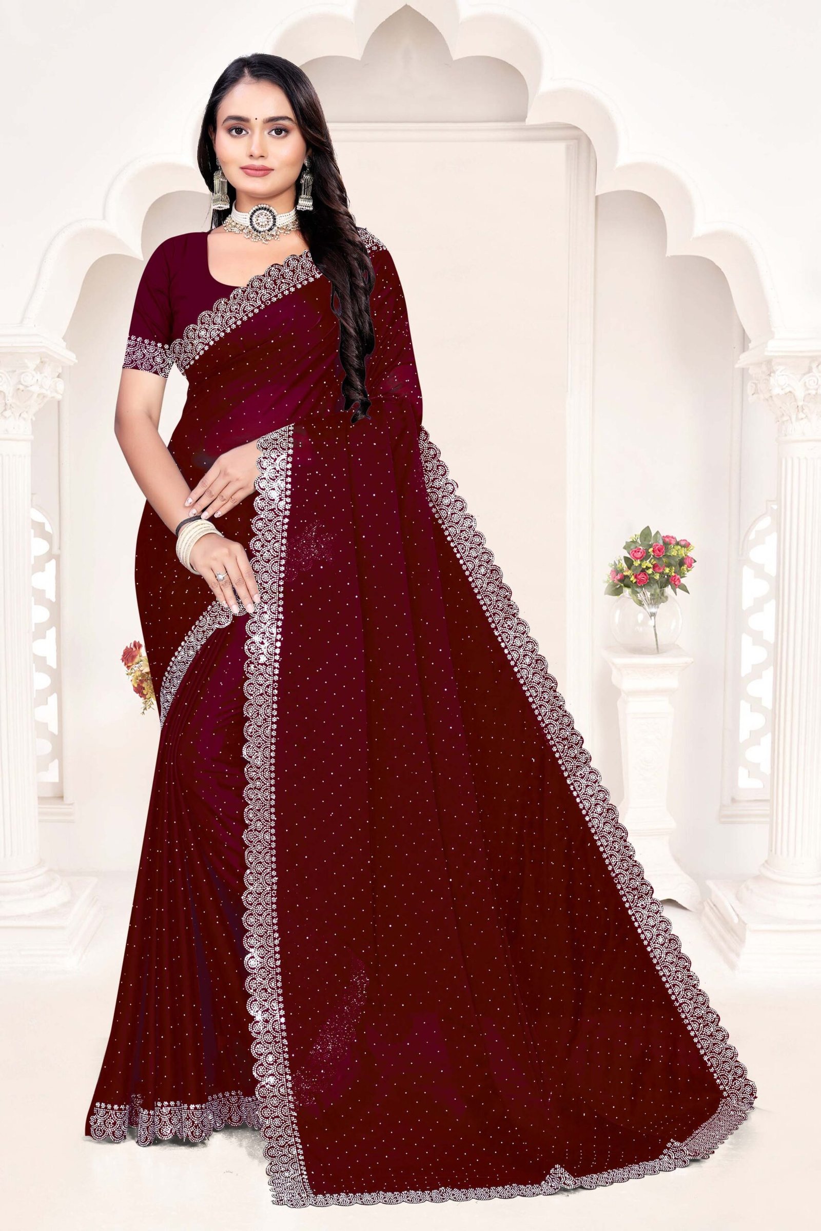 Embrace regal sophistication with our Rangoli Maroon Saree, made from premium Rangoli silk—a luxurious blend of silk and lightweight fibers known for its soft drape, subtle sheen, and breathable comfort. The rich maroon georgette-like fabric flows elegantly, accented by opulent white sequin borders and pallu featuring exquisite Siroski stone work as depicted in the image, delivering a sparkling, festive allure. Complete with a running blouse piece, this 6-meter set offers versatility for custom tailoring and multiple draping styles. Perfect for bridal events, receptions, or cultural celebrations, it fuses traditional artistry with modern glamour for an effortlessly stunning look.